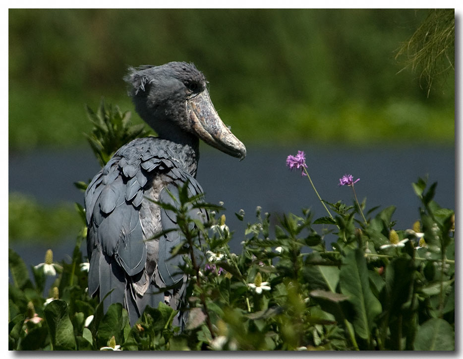 A shoebill, lives in African swamps. I sat and waited for several minutes before I was able to get a profile. Sometimes you have to stare at the back of a head for a long time, and even then you are never assured the bird will turn.