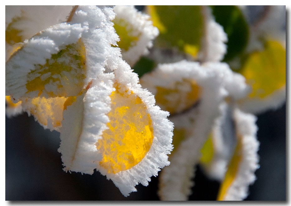 Once I arrived, I saw something I’d never encountered before, hoar frost or snow that encapsulated the leaves of the aspen.