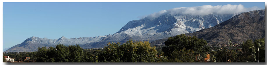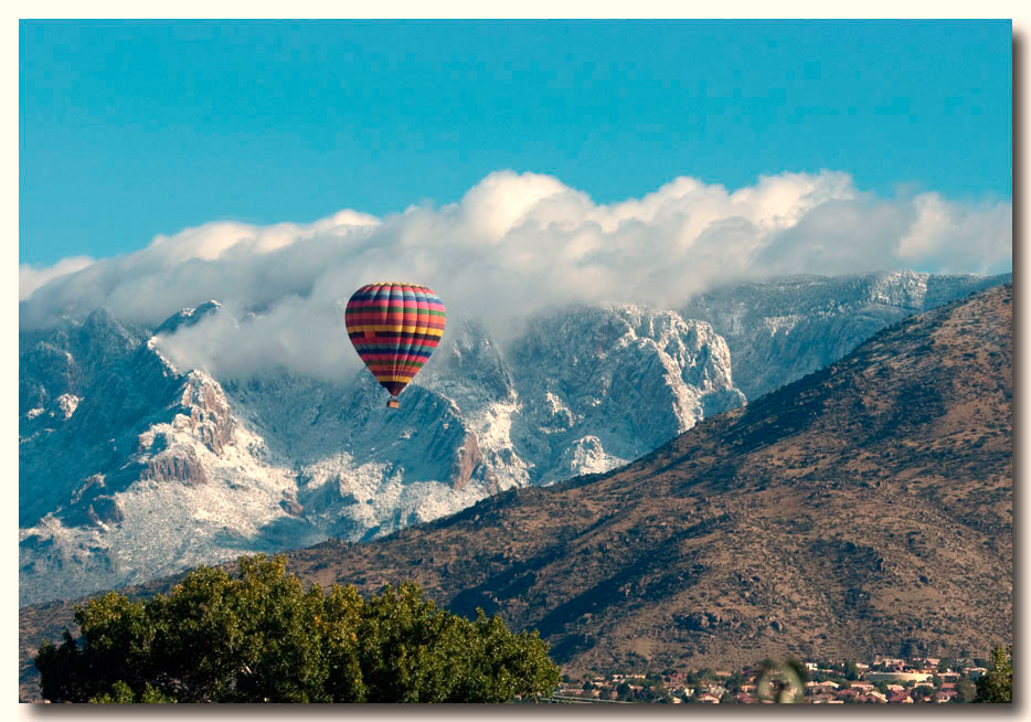 Thinking that the balloon fiesta field would be soaked and a muddy mess, we decided to wait for the Sunday morning launch. In the meantime, a couple of balloons blew across the face of the mountain allowing me to get a couple of terrific shots of a very unusual event, ballooning against the Albuquerque snow.