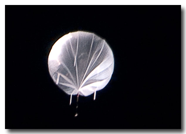 At first I thought I could see a gondola below it. I called it a gas balloon, but it turns out on magnification, it is an ordinary weather balloon. Its not as bright as the moon in this image because I wanted to see the detail.