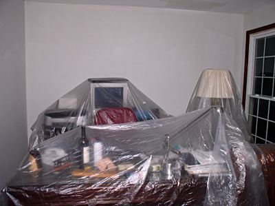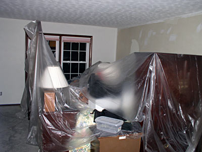 of the house, seeing strips of wallpaper ripped off this wall, and
