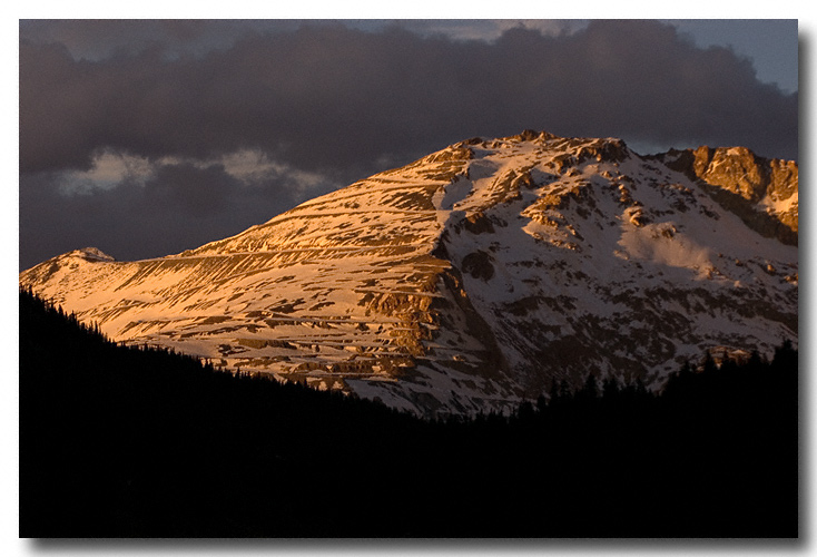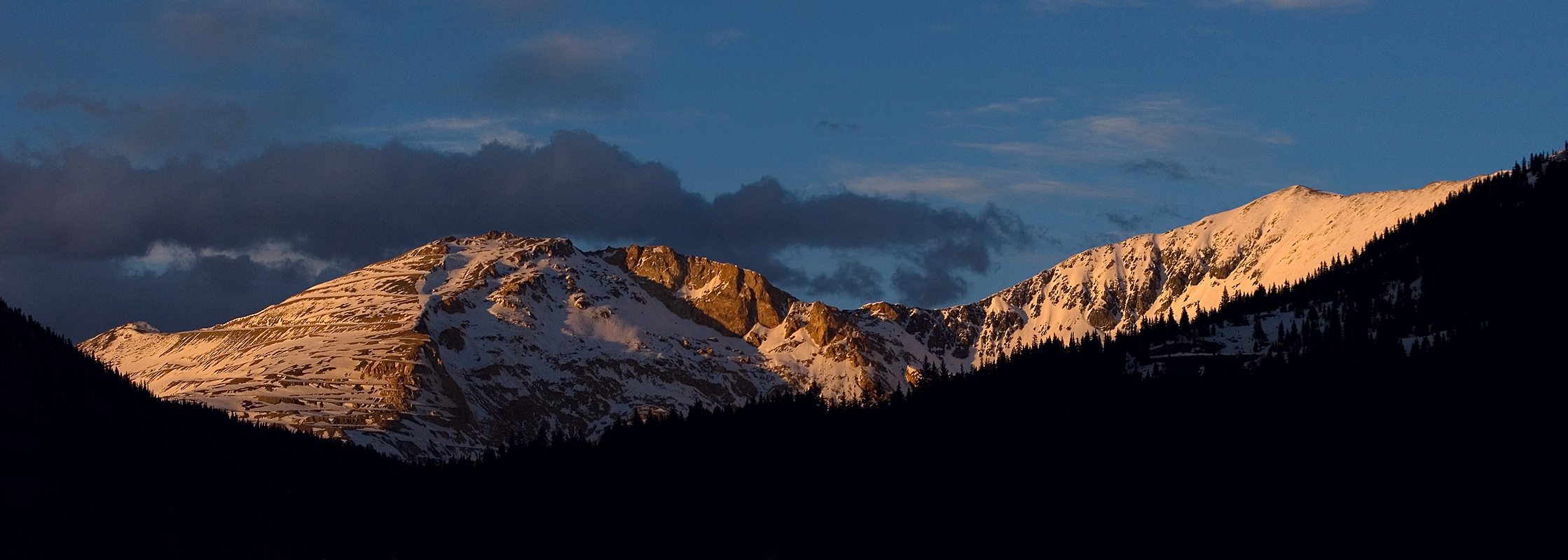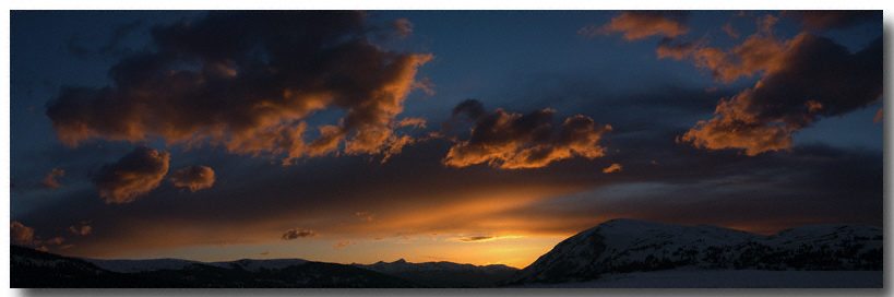 The panorama, even as dynamic as it is, is a weak sister to the experience of being there on the top of the Rockies watching the clouds reflecting the last light of the "golden hour." Larger image here.