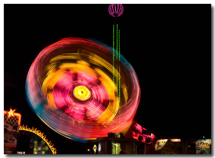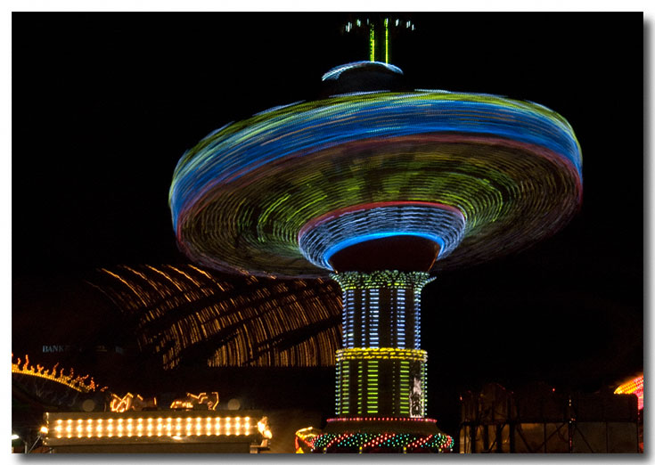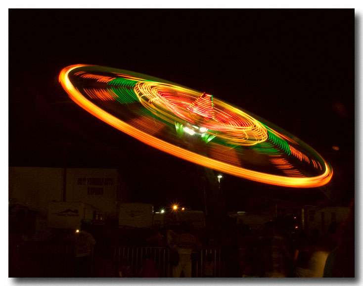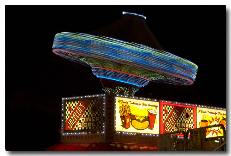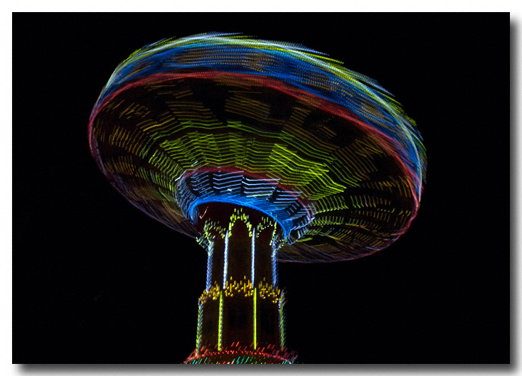 I shot one more series of the spinning swing set from just below the machine. The ragged lights remind me of some kind of photoshop effect, but I did no retouching to the image.