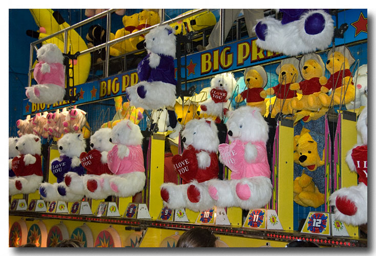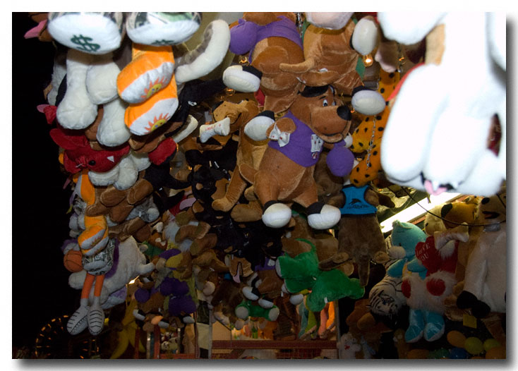 The dime toss, the basketball throw, darts and baloons, ring toss, ball toss, you name it, and there is a place on the midway for you to toss away your money in exchage for a chance to walk home with some kind of trinket that you'd probably never pick up in a store.