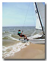 stage is a 16-foot Hobi-Cat (catamaran), white pontoons and white