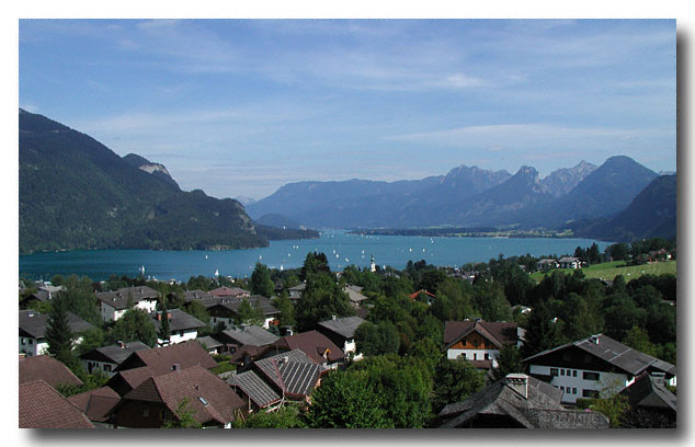 Austria - "Lakes District" near Salzburg. View from our table at a roadside Cafe. The view looks east over the town named Sankt Gilgen and the lake known as the Wolfgangsee. This town is on the route from Salzburg to Hallstadt. Digital Image 2001