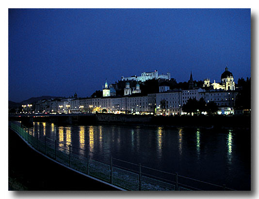 The old city of Salzburg at night. Digital Image, hand held on a bridge rail.