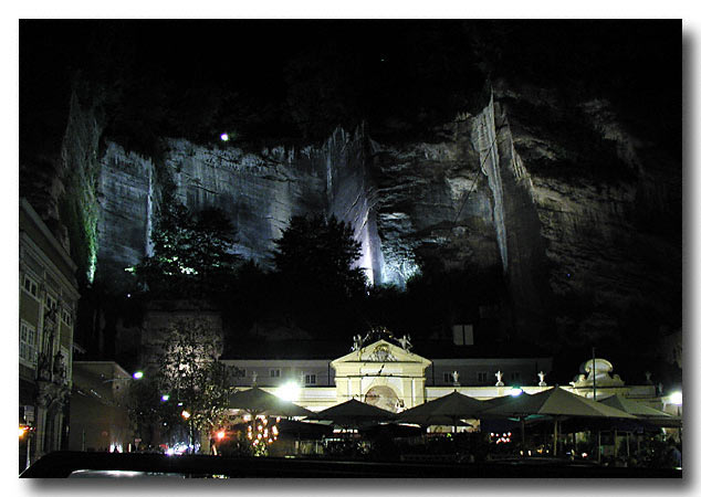 The cliffs in the old city of Salzburg, illuminated at night. Photo taken from the roof of a parked car, note the roof rack rail in the bottom left of the image. Digital image