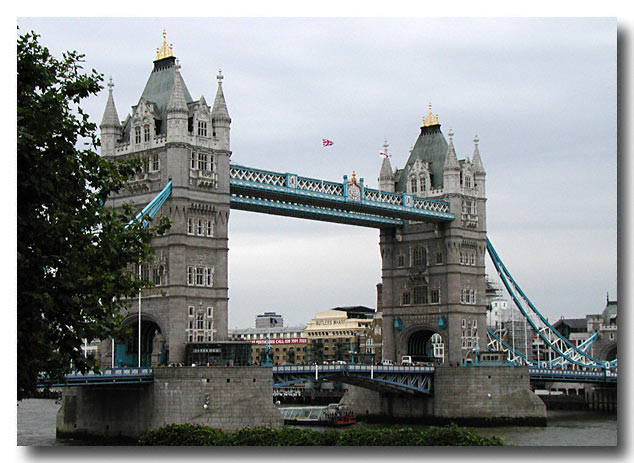 The famous Tower Bridge, Londaon, England. Taken from the grounds of the tower prison. Digital image.