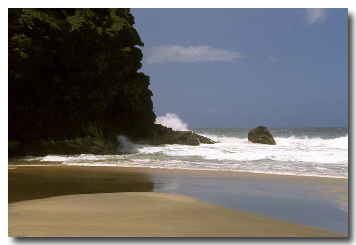 Hanakapiai Valley Beach, 2 miles in on the 11-mile Kalalau Trail. Signs warn that if you swim, you just might die. I didn't swim. Scan from a slide.