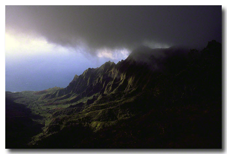 Napali Coast overlook, end of the Kokee Road. Storm clouds overrun the terrain. Scan from a slide.