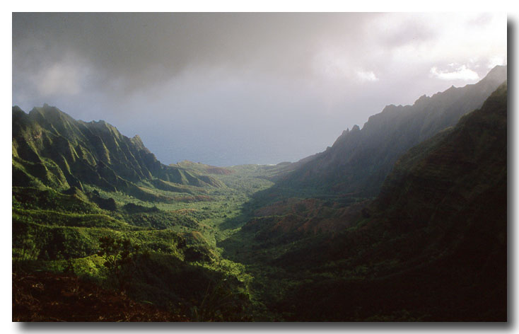 Panorama of the Kalalau valley taken from the end of the road that overlooks the Napali Coast. The summit of Kaua is one of the wettest places on earth. Larger image here.