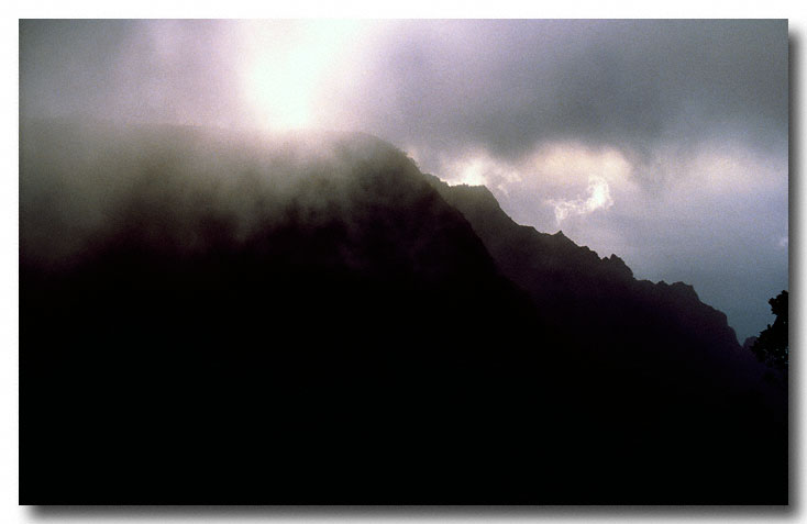 Fast moving rain clouds move over the western edge of the Napali coastal valley on the island of Kauai. Within minutes the rain clouds passed to the east producing the rainbow seen in the next slide.