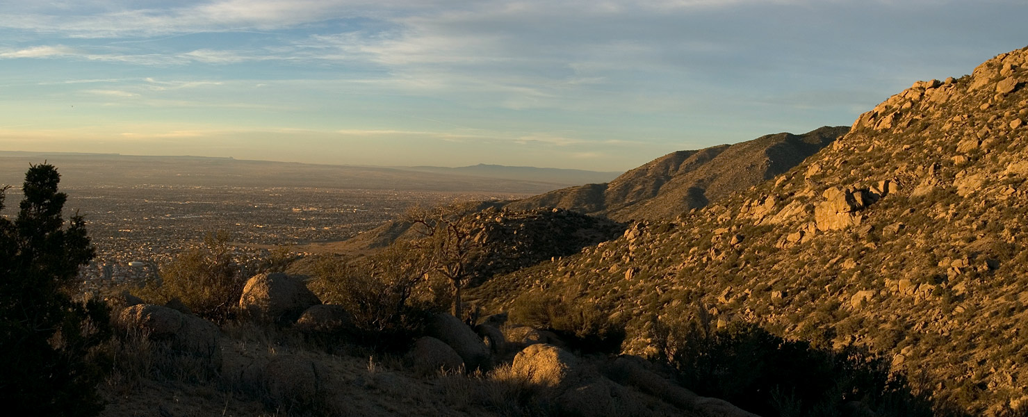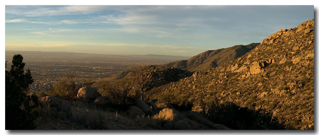 Trail view from the hike to the "Eye of the Sandias" looking northwest over Albuquerque todward the Jemez Mountain range in the distance.