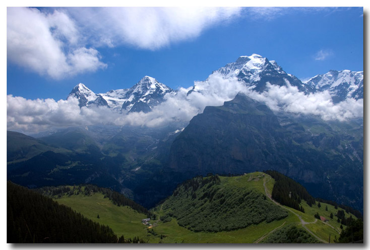 The Eiger, the Monch and the Jungfrau seen from high above the village of Murren, Switzerland. Taken from the path to the Shilthorn.