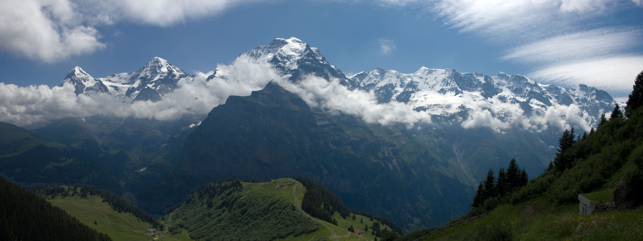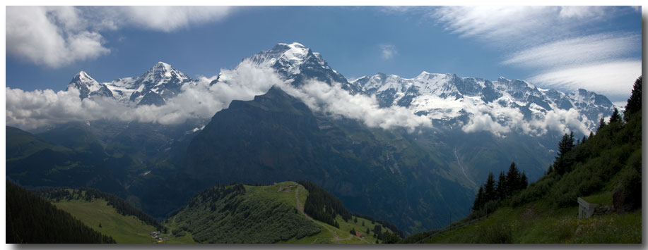 Panorama of the Eiger, Monch, and Jungfrau taken from the hiking trail on the way to the Shilthorn. Larger panorama can be found here.