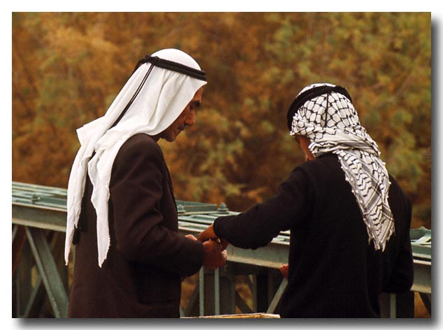 Conversation and exchange of money? Allenby Bridge over the river Jordan.