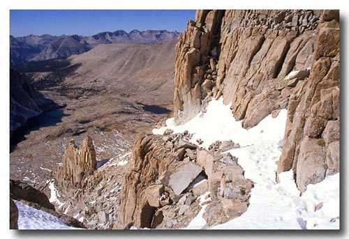 Mt Whitney, California, highest summet in the lower 48 states. View from the saddle looking into Kings Canyon National Park. Alt approximately 13,600 ft. Scan from a slide.